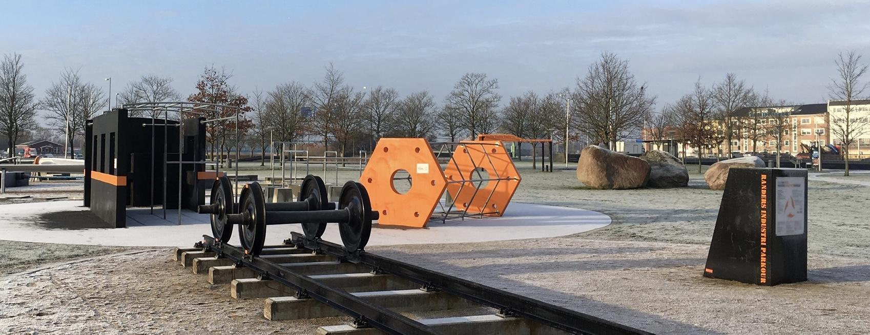 Parkouranlægget er unikt og det eneste af sin slags. Det består af autentiske eller stilistiske elementer fra den lokale industri, som tilsammen fortæller historien om industribyen Randers. Der er vindmøllevinger, reberbane, møllesten, skærebord fra en mejetærsker, togskinner, sveller, toghjul, togvogn, tandhjul.